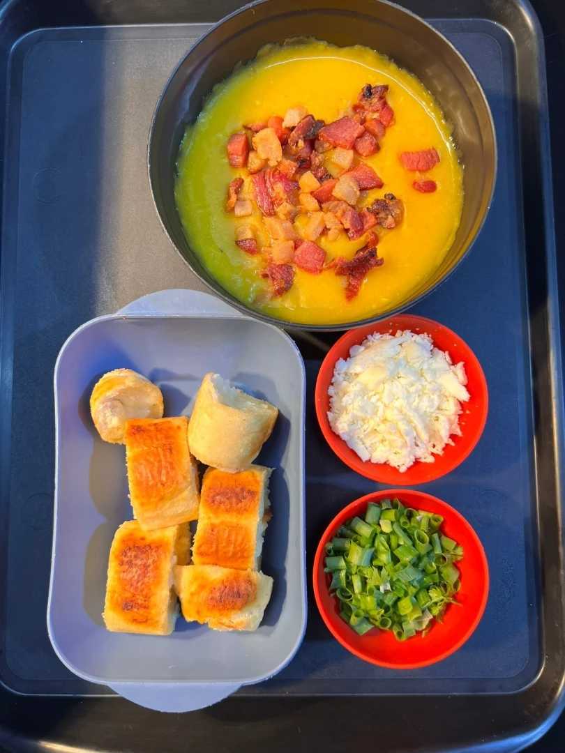 Delicioso caldo de abóbora com bacon, acompanhado de cebolinha, mussarela e pão de alho Santa Massa. 500ml